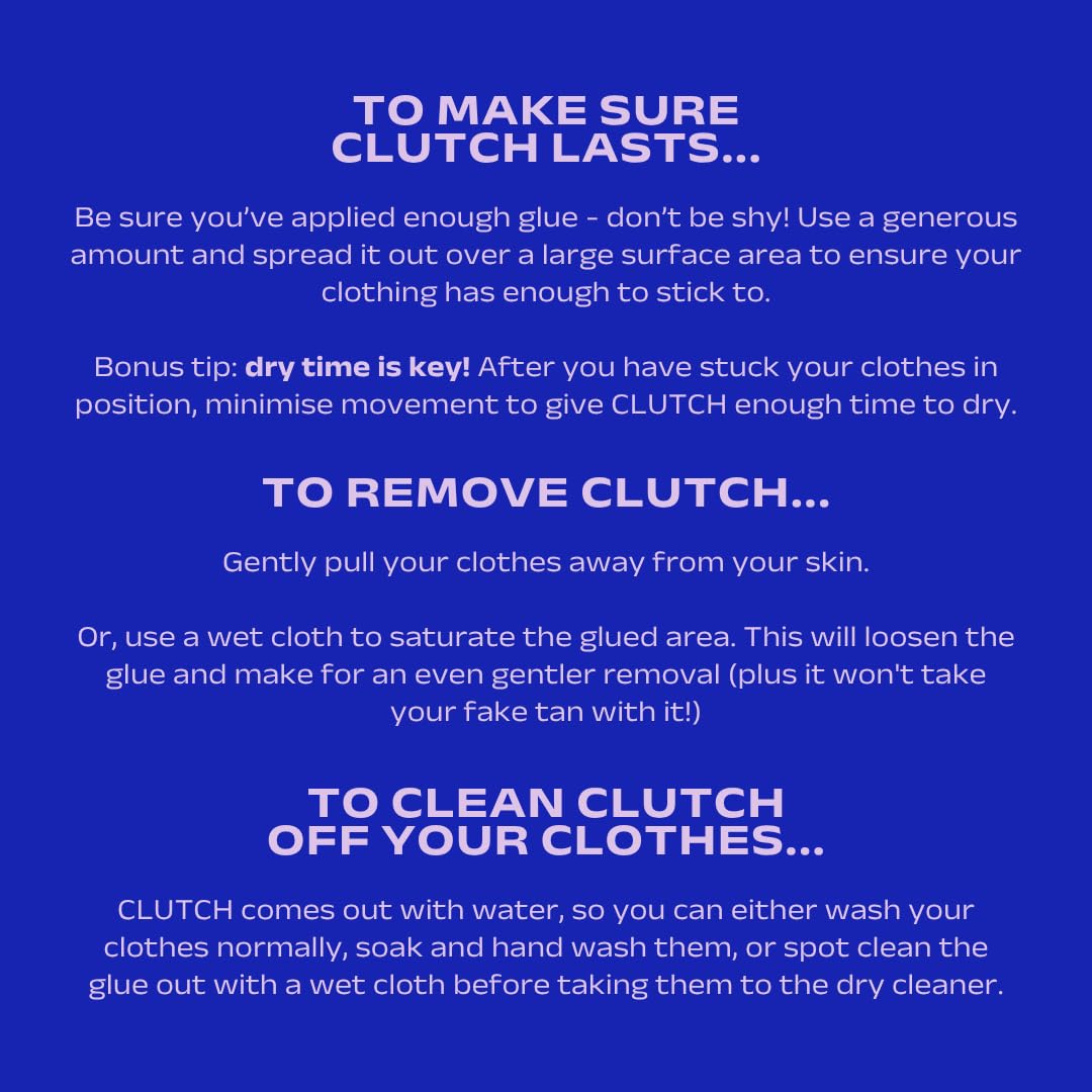 Perfect for parties, photoshoots, or daily wear, Clutch Anti-Slip Body Glue ensures you feel confident and comfortable in any outfit. Comes off easily with warm water or a damp cloth, leaving no residue.